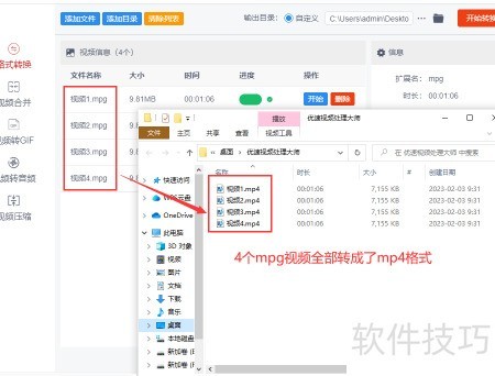 10、 所示,为转换前后文件格式的对比,可明显看出,软件已将上传的四个MPG视频成功转为MP4格式,表明所采用的转换方法切实有效,达到了预期目标。