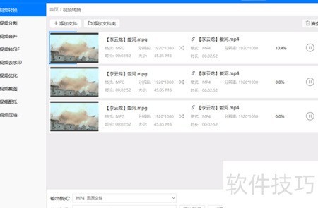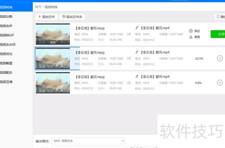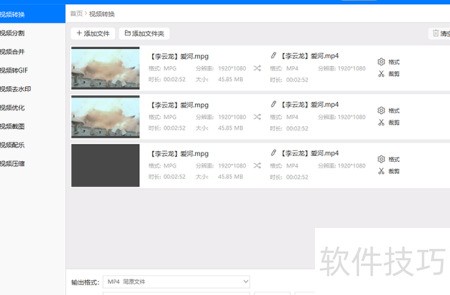 1、 将MPG视频文件导入视频转换软件,启动程序后添加所需转换的视频。可通过直接拖拽文件至操作界面,或点击添加文件按钮从文件夹中选择目标视频进行导入。