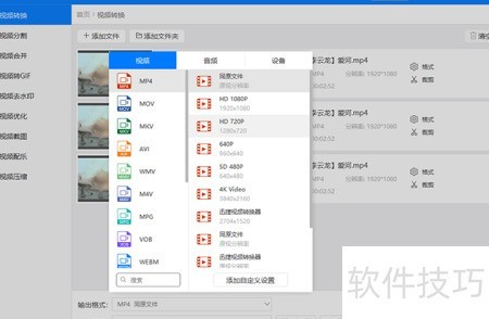 2、 点击输出格式旁的下拉箭头,选择视频选项卡,在左侧栏选中MP4格式,并在右侧区域设定所需视频分辨率。