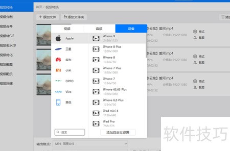 3、 若您希望在手机、平板或其他便携设备(如iPhone、iPad、iPod)上播放MP4文件,用于移动观影或导入iMovie等兼容软件进行剪辑,可进入设备选项卡,选择对应设备型号,以确保格式匹配并顺利使用。