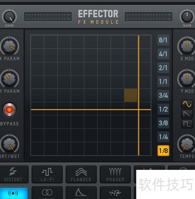 4、 可将二者视为X轴与Y轴,左侧X PARAM对应X控制器,Y PARAM对应Y控制器。BYPASS具备启用与关闭两种模式,手动调节X、Y控制器时需设为关闭,按钮调节时则启用。DRY/WET用于调整干声与湿声的混合比例。