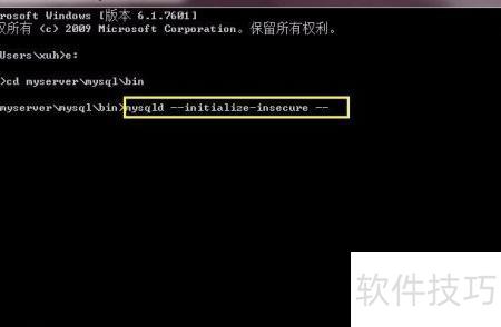 4、 打开命令提示符窗口,切换至MySQL安装目录下的bin文件夹。输入指定命令执行操作(注意:所有--前需加一个空格,建议直接复制命令以避免遗漏空格)。