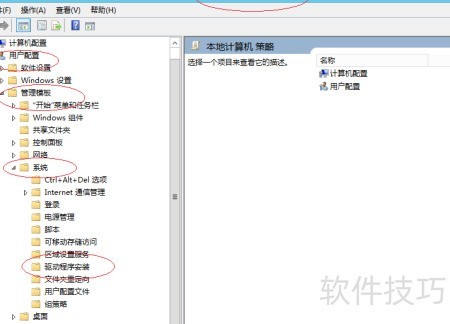 2、 进入用户配置中的管理模板,选择系统下的驱动程序安装文件夹