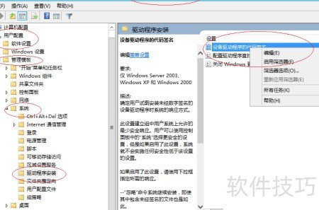 3、 右键点击右侧设备驱动程序的代码签名图标,选择编辑选项。