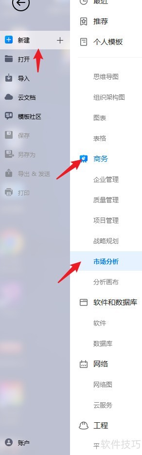 2、 点击新建,选择商务类别下的市场分析。