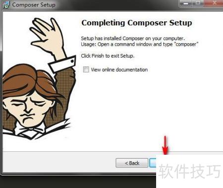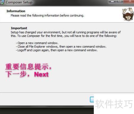 8、 安装完成后,Composer将显示后续操作提示,请继续下一步。