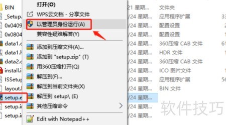 3、 解压后进入安装目录,右键点击setup.exe选择以管理员身份运行(XP系统可直接双击运行)。