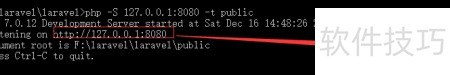 8、 通过内置PHP服务器启动Laravel框架,执行命令:php -S 127.0.0.1:8080 -t public,即可在本地8080端口运行项目。
