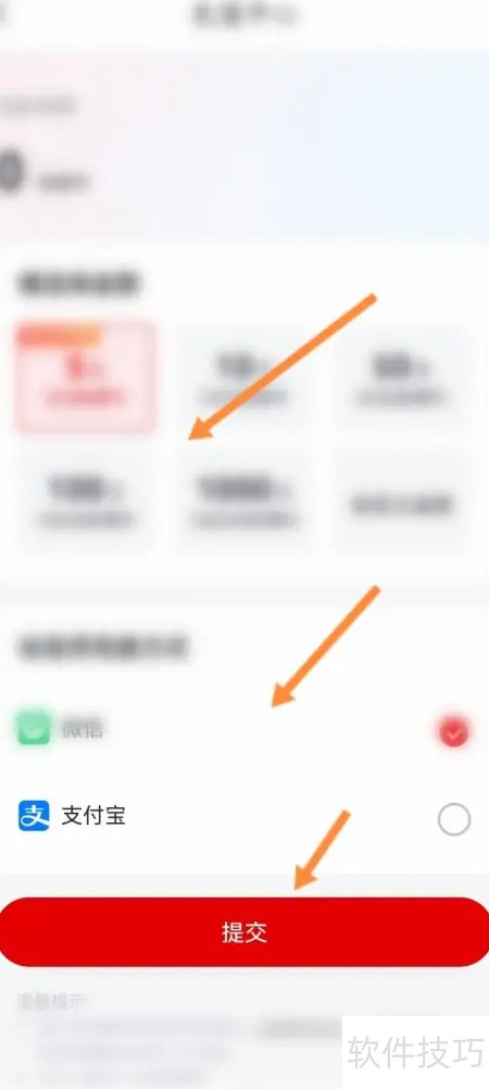3、 选择充值金额和支付方式后,点击提交即可完成。