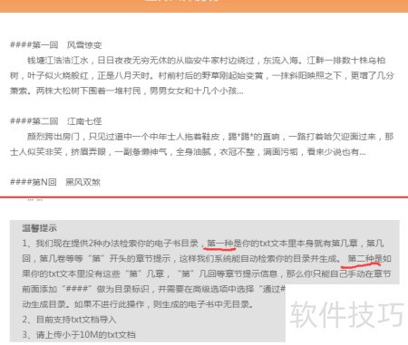 8、 若你的TXT文本中缺少第X章或第X回等章节标记,则需手动在各章节前添加作为目录标识,并在高级设置中勾选通过检索目录,系统方可自动生成目录。若未按此操作,最终生成的电子书将不包含目录结构,具体效果所示。