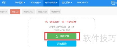 2、 通常可将EPUB、MOBI格式的电子书直接转换为TXT文件。在所示界面中,点击选择文件按钮,选取需要转换的EPUB或MOBI格式电子书,即可完成格式转换操作。