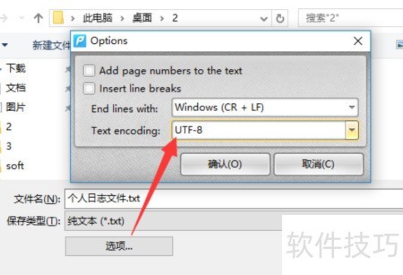 6、 保存为文本文件时,需点击选项按钮设置编码格式,一般推荐选择UTF-8编码,以确保文本内容正确保存和兼容性。