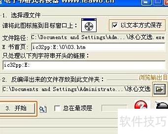 3、 系统将自动识别文件路径及链接等内容。请确保已勾选以文本方式保存选项,随后可自定义反编译后文件的存储目录,即设定输出路径。全部设置完成后,点击开始按钮即可执行操作。