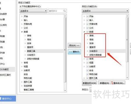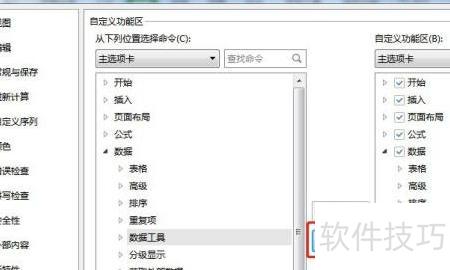4、 在右侧自定义功能区中,选择数据下的数据工具,点击删除按钮。