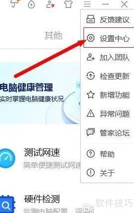 4、 进入软件界面后,点击右上角菜单栏,在下拉选项中选择设置中心即可进入相应页面。