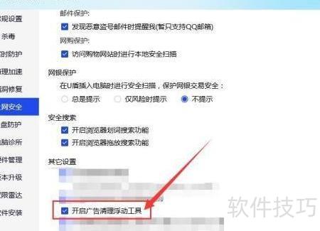 6、 所示,在上网安全页面的其他设置中,勾选开启广告清理浮动工具即可完成设置。