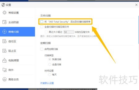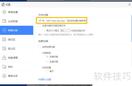 4、 在病毒扫描设置里,开启将360 Total Security加入右键扫描菜单的选项。