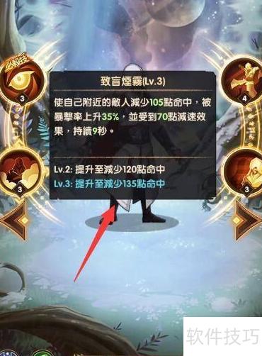 8、 技能三为致盲烟雾,释放后使周围敌人命中率下降,暴击率上升,并附带减速效果,持续数秒。