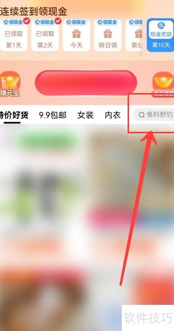 4、 进入签到领现金页面,点击搜索框查找心仪商品并加入购物车即可。