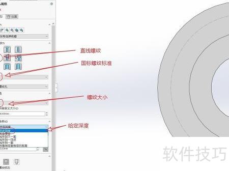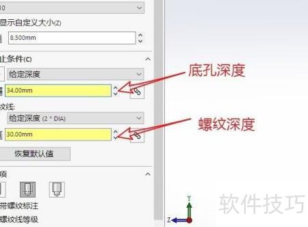 4、 使用异型孔向导功能,选择直螺纹孔类型,标准设定为ISO,规格选M10,终止条件设为给定深度,底孔深度设为34mm,螺纹有效深度为30mm,并对螺纹孔尺寸进行相应编辑。