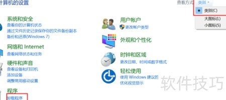 4、 在任务栏搜索框输入控制面板,将查看方式设为类别,点击进入卸载程序选项。