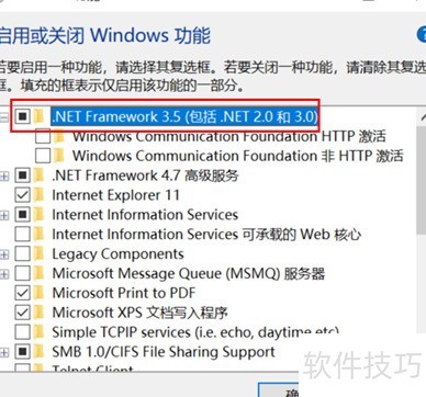 6、 检查启用或关闭Windows功能中.NET Framework 3.5(包含.NET 2.0和3.0)是否已勾选,若未勾选,请选中该项,然后点击确定按钮完成设置。