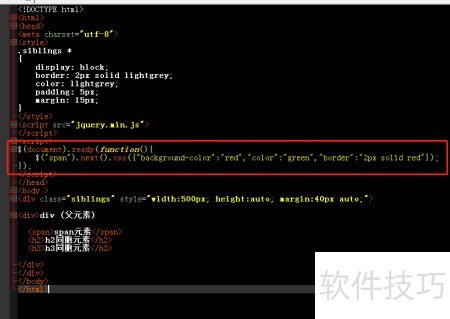 5、 通过next方法查找span元素的后续元素,并设置其背景色、前景色及边框颜色,实现文档准备中的样式调整。