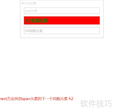 jQuery中的next方法用于获取当前元素的下一个同级元素,返回结果可用于后续操作与属性设置。