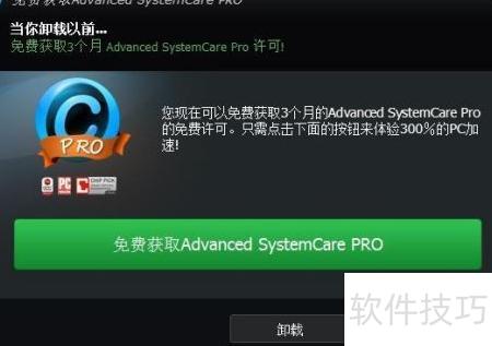 3、 卸载Advanced SystemCare时,系统会提示免费获取Advanced SystemCare PRO。此时只需点击该选项,便可跳转至付费版本的页面,完成升级操作。此过程容易误导用户误购,需谨慎对待提示信息,避免非预期的消费行为发生。