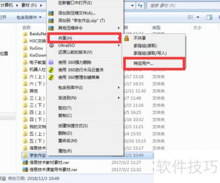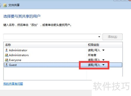 2、 将学生提交作业的文件夹设置为Guest可读写权限,操作方法:右键点击文件夹,选择共享,添加Guest用户并设置为读取与写入权限。