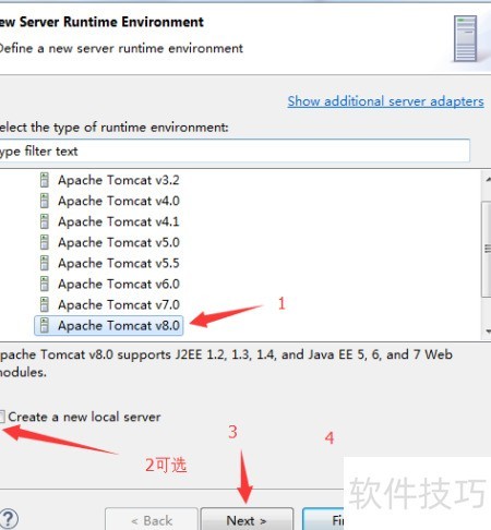 3、 在弹出的窗口中,根据图示选择服务器版本,此处我选用了Tomcat 8。