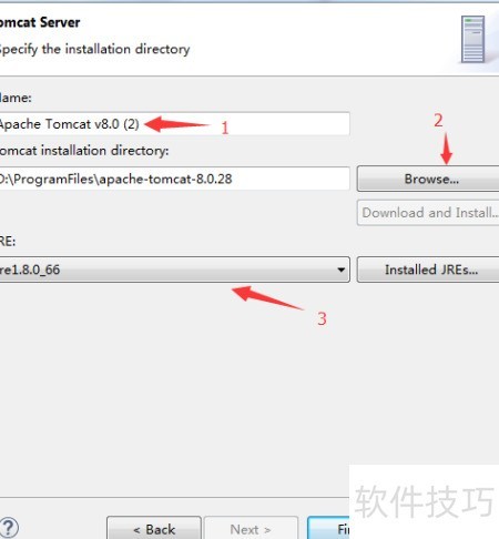 4、 输入自定义的Tomcat服务名称,设置本地Tomcat安装路径及Java JRE路径,确认无误后点击完成即可。