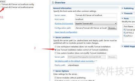 5、 配置完成后,Eclipse左侧的项目资源管理器中会显示Servers项,或在底部控制台的Servers区域出现与图示相同的服务器图标。双击任意一处均可进入设置界面,并依照图片中的步骤进行后续操作即可完成配置。整个过程直观简便,便于快速部署和调试。