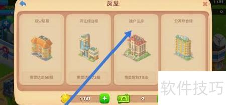 在梦想城镇中查看独户住房,只需进入建筑菜单,选择住宅类别即可找到并建造独户住房。