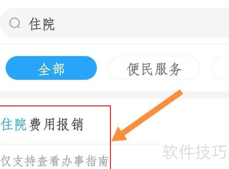 1、 打开应用首页,点击顶部搜索框,输入住院费用报销进行查询。