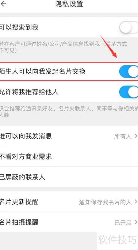 3、 在隐私设置中可找到陌生人可发起名片交换选项,详见下图所示。