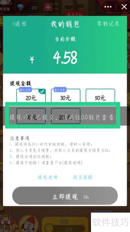 4、 提现成功后会显示提现请求已提交,请到QQ钱包中查看具体信息。