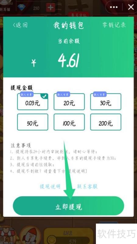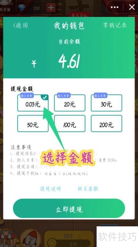 2、 打开钱包页面,查看余额后选择可提现金额,余额不足则无法操作,具体所示。