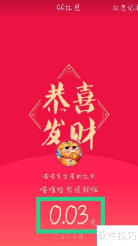 6、 打开红包后,提现金额将自动存入QQ余额,具体所示。