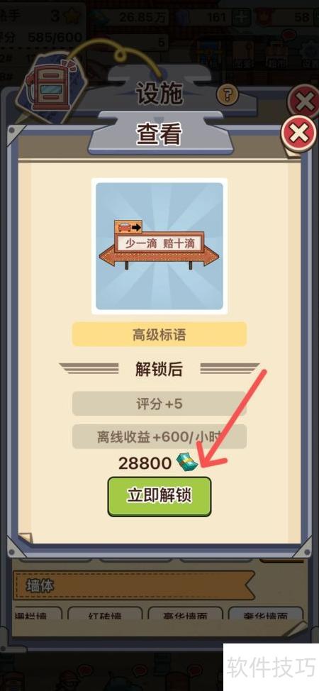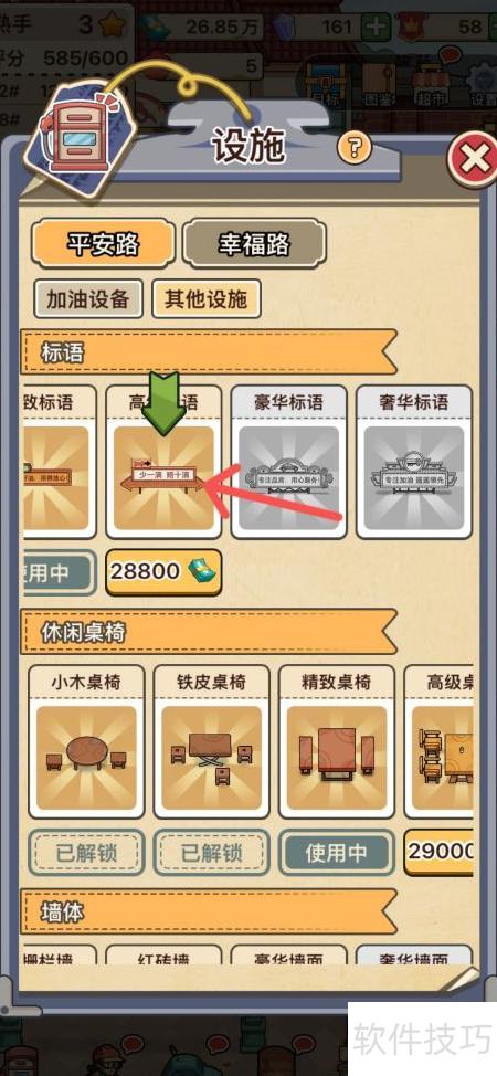 2、 在设施列表中选择需解锁的高级标语并点击