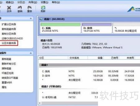 3、 分区助手包含菜单栏、操作列表和磁盘管理界面三部分,选择左侧分区恢复向导即可进入相应功能,具体操作所示。