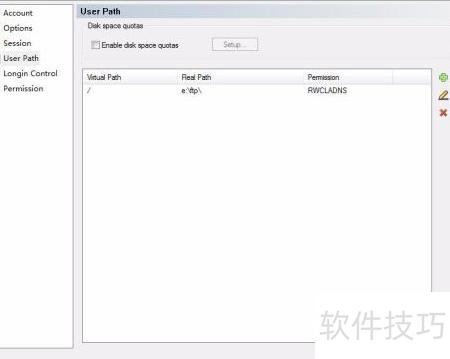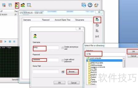 3、 接下来需要添加用户。点击地址栏左侧,待工具栏图标激活后,选择对应图标打开设置窗口,点击右侧增加用户按钮进入新界面。输入用户名和密码(请牢记,用于后续登录),然后设置存储路径,此处我选定了E盘中新建的ftp文件夹作为保存位置,最后点击保存完成操作。