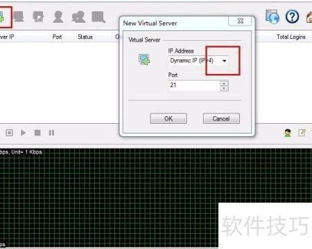 2、 接下来我们添加一个FTP连接。点击软件左上角的添加按钮,会弹出一个设置窗口。在窗口中只需输入IP地址(点击IP栏的下拉箭头可显示本机IP,直接选择即可),其余参数保持默认,无需修改。填写完成后点击保存,关闭对话框。此时主界面将显示出刚添加的IP地址,其状态为stop,对应图标呈红色,表示当前未连接。