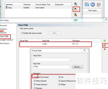 4、 新增用户后,在用户列表中可看到该用户。选中刚创建的用户,点击左侧编辑用户按钮,进入编辑界面。选项较多,无需关注其他内容,直接进入user path设置项。在弹出的权限对话框中,默认已勾选读取和列表权限,还可根据需要选择写入、重命名等权限。此处将所有权限全部勾选,确认保存后返回用户管理界面,再次保存并退出对话框,最终回到初始页面完成操作。整个过程简洁明了,便于快速配置用户访问权限。