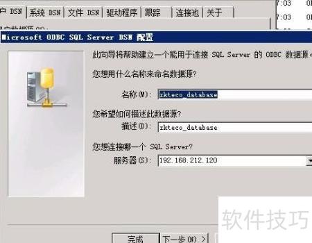 6、 在新建数据源的配置界面中,名称与描述需与SQL Server一致,避免第10步无法识别数据库;服务器选项填写SQL Server的IP地址,完成后点击下一步继续操作。