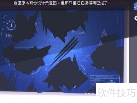 2、 右侧墙上有张破损的蓝色设计图,将之前从第三个箱子获得的碎片拼合上去,便可得知第四章的核心任务是完成整幅设计图的复原。