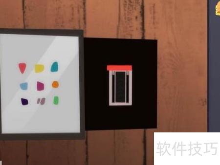 10、 返回杂物间拼好设计图,获得密码1,输入黄色屏幕后开启机关,通往另一间密室。