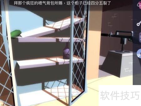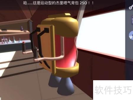15、 返回银白色密室,发现电梯右侧的门已开启。进入房间,见到了一间实验室,取走桌上的遥控器和地上的扳手。右侧放置着一个喷气背包,按下红色按钮即可启动,喷射后撞开柜门,从中取出一只水桶。