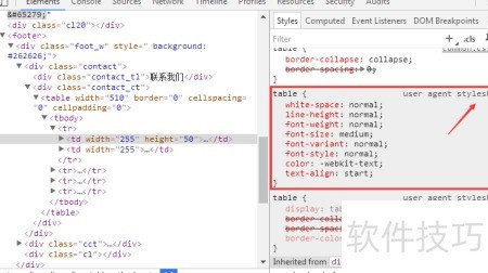 2、 在弹出窗口中定位到相关元素,检查控制错误样式的代码位置。我发现文字颜色的异常出现在table标签上,样式显示来源于user agent stylesheet,说明该样式继承自浏览器默认设置,表明我们自身的样式表中并未对此处进行定义或覆盖,因而采用了浏览器的默认呈现方式。