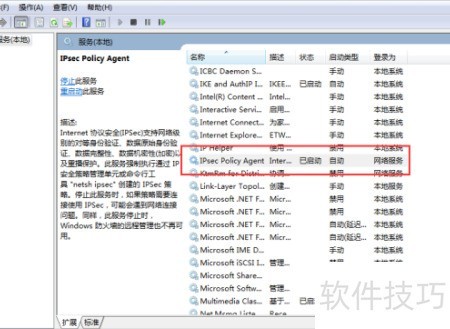 4、 在服务对话框的右侧区域,定位到IPsec Policy Agent项,双击该选项以打开其属性设置界面,具体操作所示。